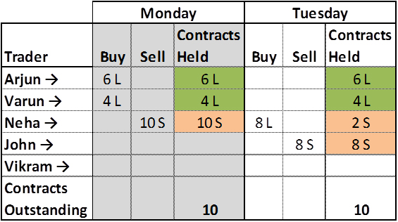 Monday: Arjun purchases 6 futures contract futures, Varun buys 4, and Neha sells every one of the 10 futures contracts. There are now 10 total contracts, 10 on each side (6 + 4), and 10 on each side (10 + 4); hence the open interest of 10. The table below summarizes this information.