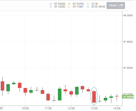For example, let's say I held this position until 12:30 PM on 27 July, and then let it expire. Let us assume that the price is 67.4000. I'd then be able make -
